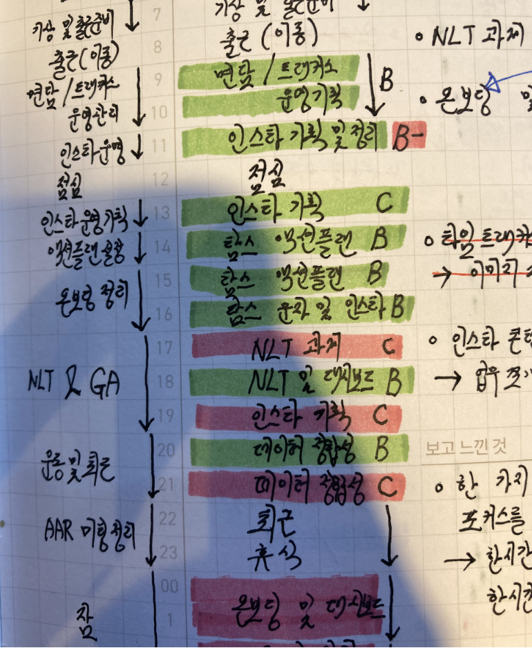 업무량이 상당히 많고, 업무 스콥 또한 넓다 보니 시간 관리를 제대로 하지 않으면 살아남을 수 없었다. 회사에서도 항상 시간 관리에 대한 중요성을 강조했고, 무엇보다 다이어리 제품을 맡다보니 시간 관리를 잘하기 위해서 더 노력했다. 항상 구글 타이머로 한 시간을 맞춰두고, 시간이 울리면 한 시간을 내가 어떻게 보냈는지 다이어리에 작성하고 색깔로 칠했다. 빨간색은 가장 별로인 것, 초록색은 보통, 파란색은 밀도 있는 시간을 보낸 것으로 색깔별로 시간의 농도를 측정했다. 이를 통해 시간 관리를 어떻게 개선시킬지, 이 시간은 왜 내가 잘 보냈는지에 대해서 피드백하고 기록했다.