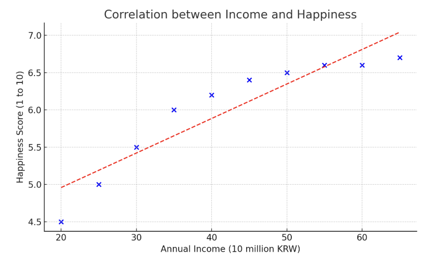 또 다른 이야기로 설명하자면 '연소득'과 '행복도' 두 가지 키워드의 관계성을 데이터로 확인한다고 치자. 시각화를 했더니 연소득이 증가할수록 행복도가 증가하고 있는 사실을 그래프를 통해서 확인했다. 우리는 이를 통해 "연소득이 증가할 수록 행복도도 증가하는구나"라고 생각할 수 있다.